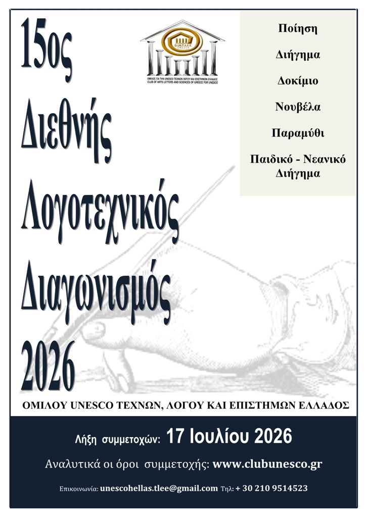 Ο Όμιλος UNESCO Τεχνών, Λόγου και Επιστημών Ελλάδος με ιδιαίτερη χαρά προκηρύσσει τον 15ο Διεθνή Λογοτεχνικό Διαγωνισμό 2026, με λήξη τη 17η Ιουλίου 2026.